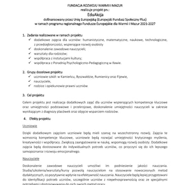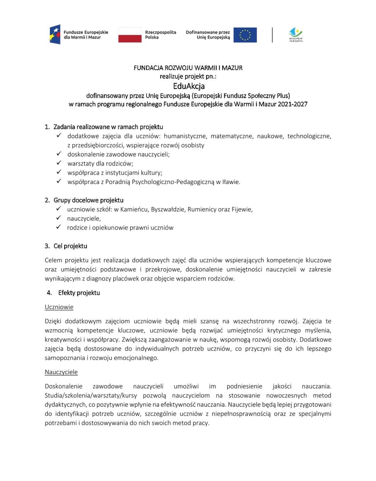 FUNDACJA ROZWOJU WARMII I MAZUR realizuje projekt pn.: EduAkcja dofinansowany przez Unię Europejską (Europejski Fundusz Społeczny Plus) w ramach programu regionalnego Fundusze Europejskie dla Warmii i Mazur 2021-2027